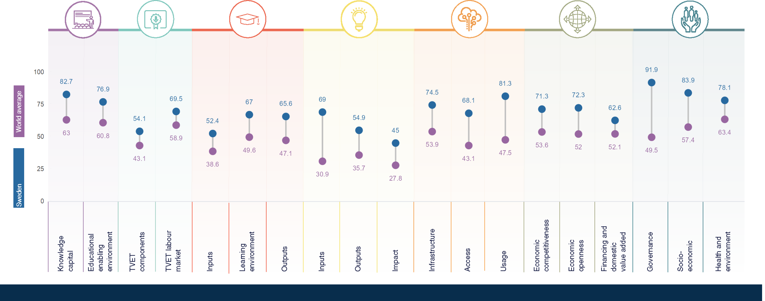 Sweden is a leading performer in terms of its knowledge infrastructure. It ranks 1st out of 141 countries in the Global Knowledge Index 2024 and 1st out of the 59 countries with very high human development.